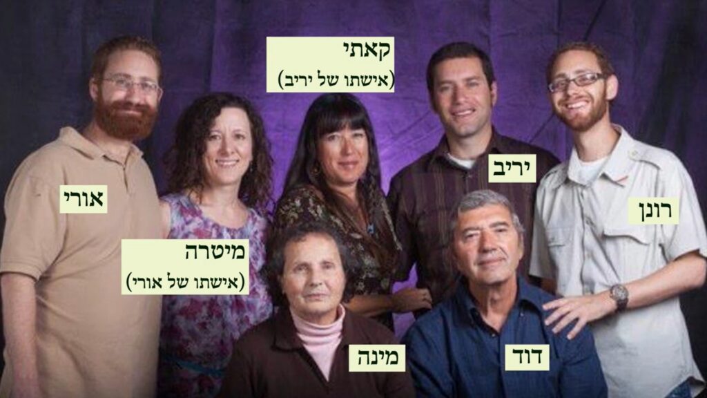 Давид Донде и его жена Мина с сыновьями (слева гаправо) Ури с женой Митра, Ярив с женой Кати и Ронен. Видео משפחת דונדה מקיבוץ כפר גלעדי